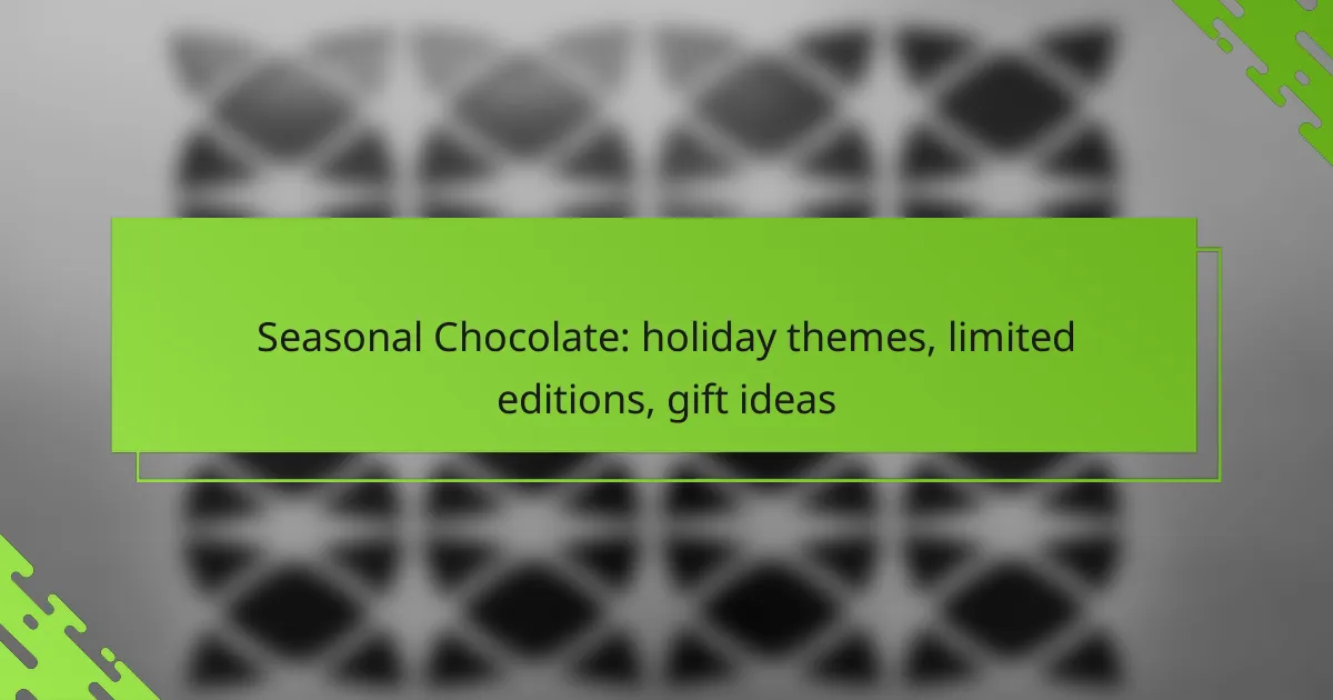 Seasonal chocolates offer a delightful way to celebrate holidays and special occasions, featuring unique flavors and festive packaging that enhance the spirit of gift-giving. With a variety of artisan selections and limited-edition collections from well-known brands, these chocolates cater to diverse tastes and preferences. Thoughtfully choosing chocolates that align with the recipient’s likes can elevate the gifting experience and create lasting memories.